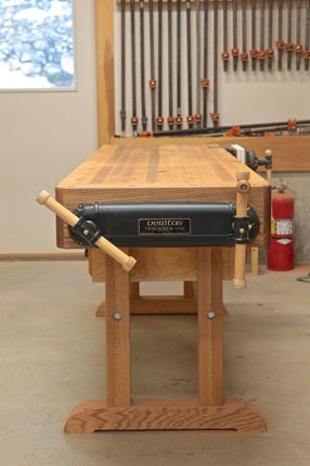 The perfect workbench for professional woodworkers and hobbyists. Heavily constructed, outfitted with storage drawers, and two vises specially chosen for their extreme versatility. Pictured is the prototype used in our shop, however we will gladly help you design a bench suited to your personal requirements. Ordering a custom workbench includes delivery and set up.